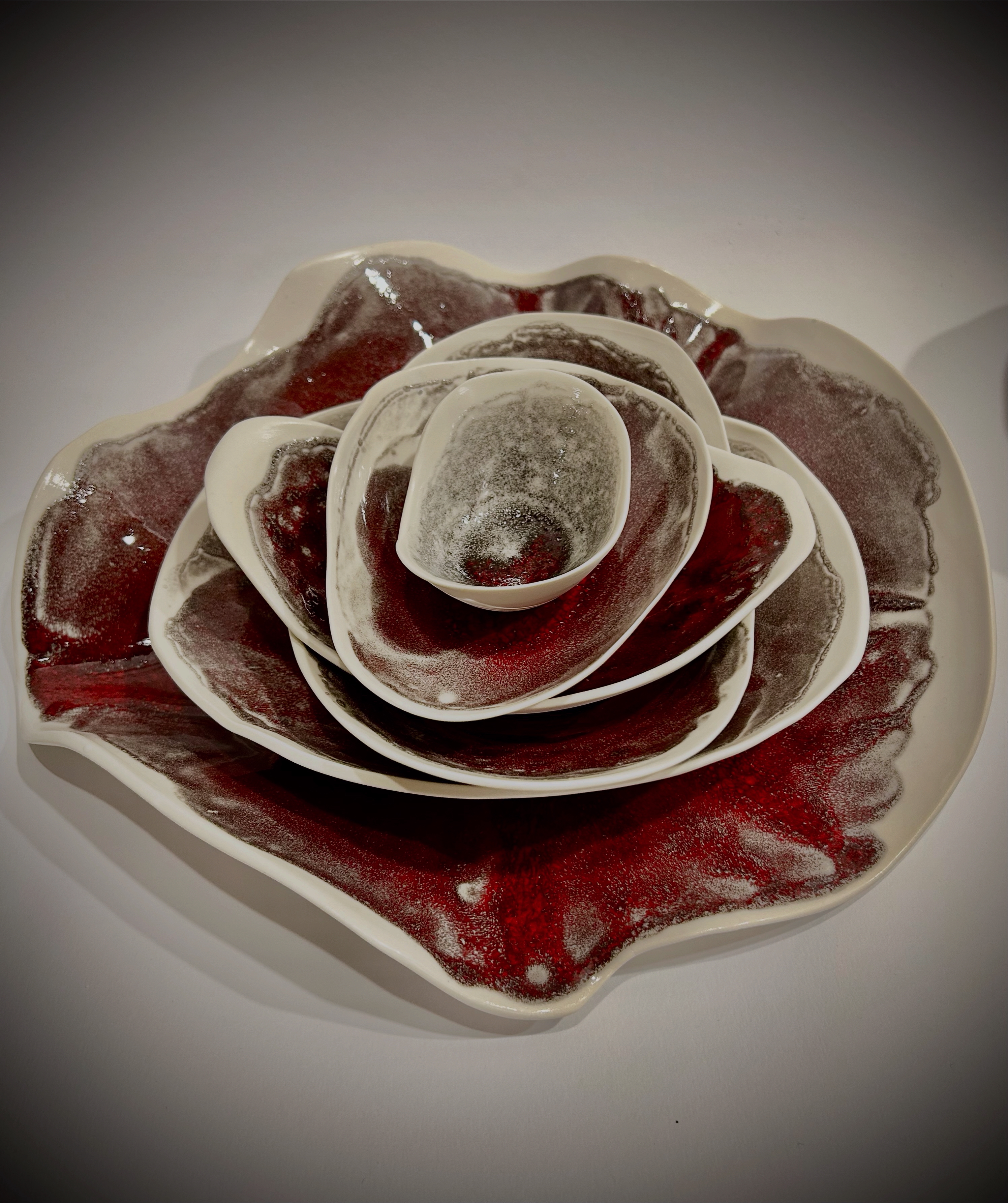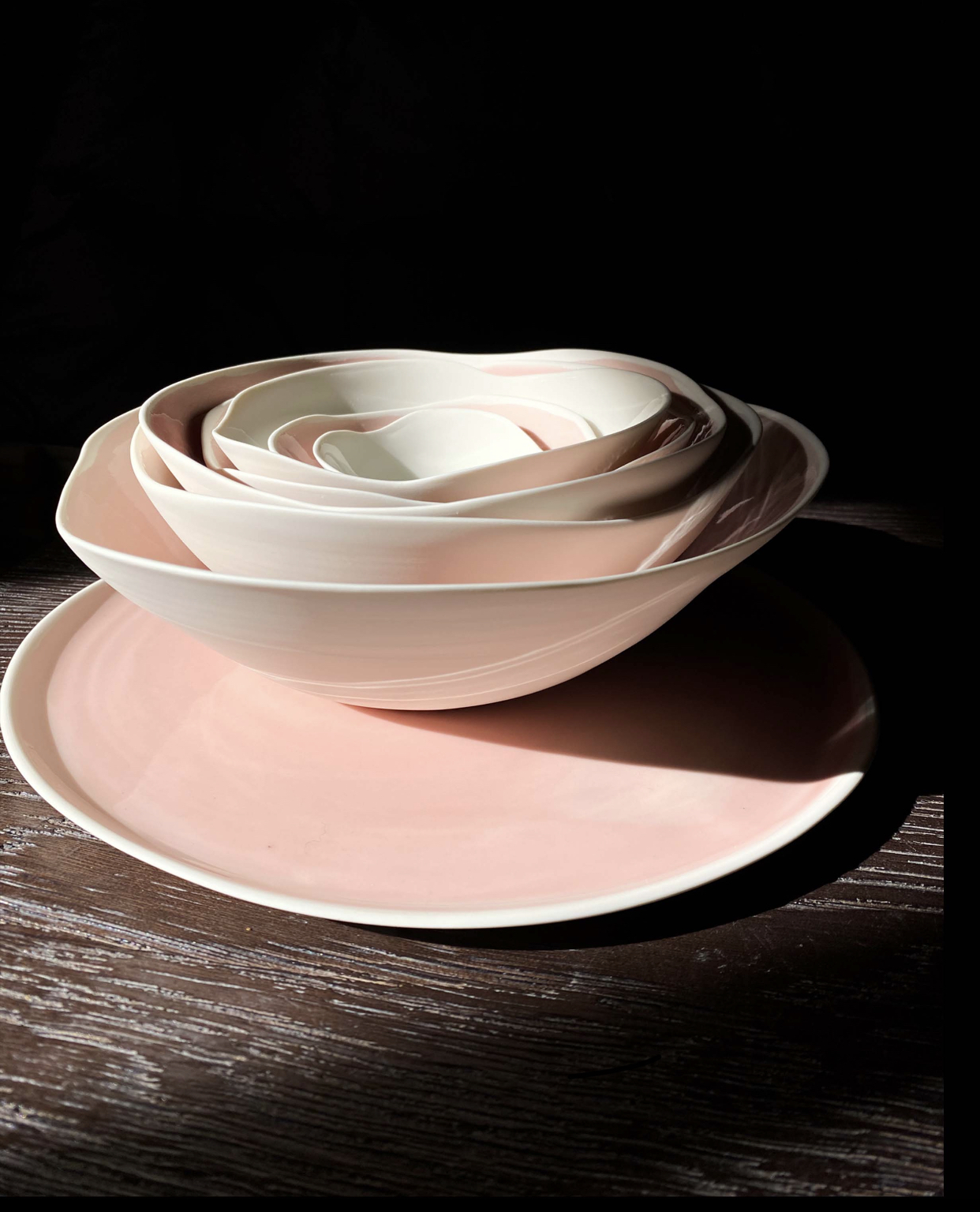 Different tones of pink and white inside, with natural, polished porcelain outside.